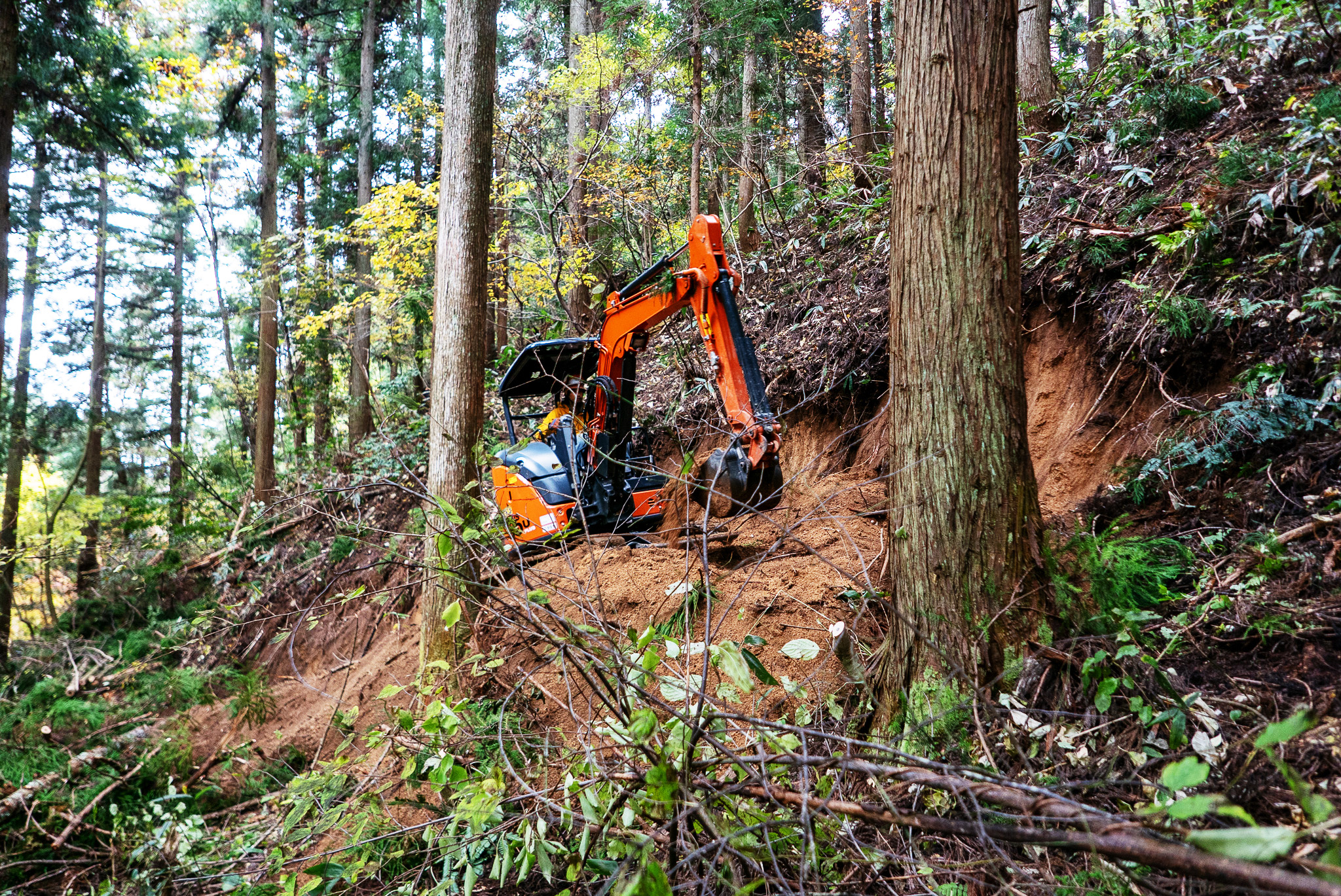 作業道づくりは、バックホーを使っての道づくり。作業道というと搬出のための一時的な道と捉える人も多いのですが、間伐と管理のための高密度路網形成をはかるもの。長期にわたって壊れない美しい道をつけるものです。見学体験から実習指導、ルートづけなど支援メニューも多彩です。