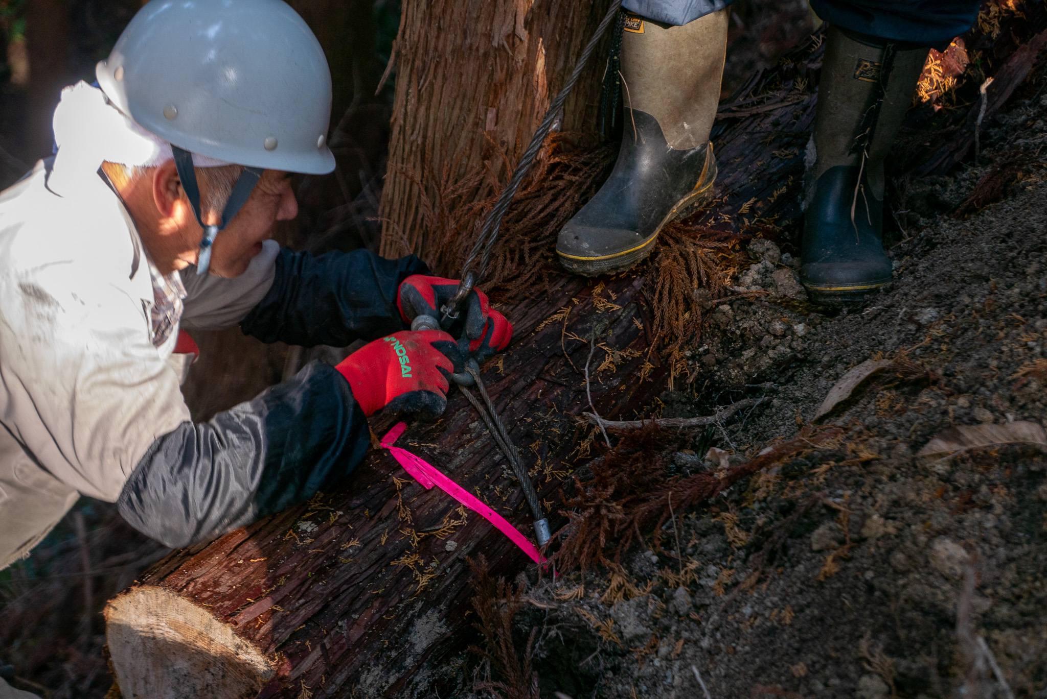 実践研修は山仕事やろう会(やまやらこい)とも言って、経験者向けですが、集材コースは初心者も可。講師と一緒に作業をしながらの、練習と実践と研修が同時にできるような、楽しい会です。